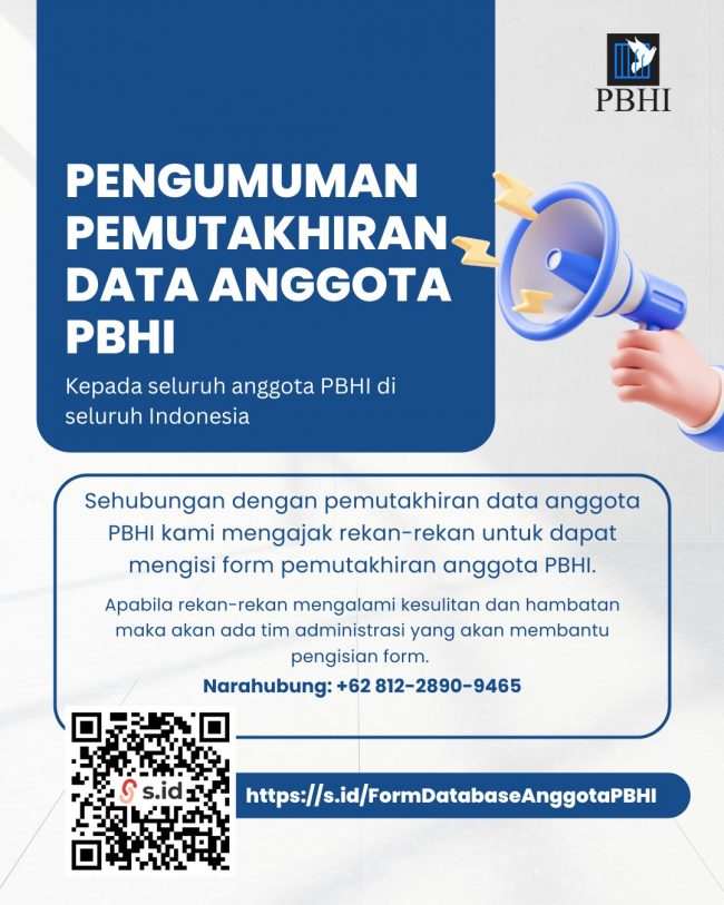 PERPANJANGAN PENERIMAAN BAKAL CALON KETUA BADAN PENGURUS NASIONAL (BPN);MAJELIS ANGGOTA NASIONAL (MAN); DANDEWAN KEHORMATAN (DK)PBHI PERIODE 2025-2029 Timeline Perpanjangan Usulan Calon BPN, MAN, dan DK: Minggu, 25 Januari 2026 Penerimaan kelengkapan berkas paling lambat pada Sabtu, 31 Januari 2026 Usulan Perubahan AD/ART PBHI paling lambat pada Sabtu, 31 Januari 2026 Akses dokumen pencalonan dan perubahan…